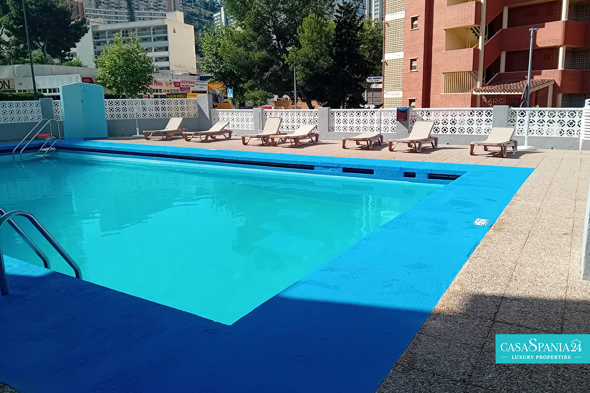 El edificio cuenta con piscina comunitaria y aparcamiento comunitario, y se encuentra en una zona con numerosos restaurantes, tiendas y atracciones turísticas, incluyendo un parque acuático. Una excelente oportunidad tanto para inversión como para una vivienda vacacional en el corazón de Benidorm.