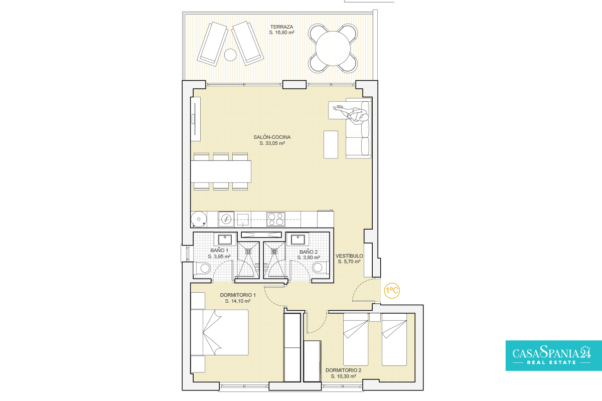 Este apartamento de 2 dormitorios y 2 baños cuenta con una amplia terraza de 16 m² y destaca por su diseño moderno y exclusivo. La construcción está realizada con tecnología de vanguardia, ofreciendo un aislamiento térmico y acústico de alto nivel, sistemas de aerotermia y aire acondicionado integrado, para garantizar el máximo confort durante todo el año.