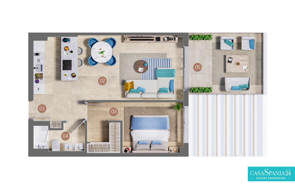 Este elegante apartamento está diseñado para un estilo de vida moderno y relajado. Ofrece un cómodo dormitorio, un amplio baño, un luminoso salón con cocina americana y una terraza de 13 m², perfecta para momentos de relax al aire libre. Cada espacio combina funcionalidad con diseño contemporáneo, creando un ambiente acogedor y refinado.