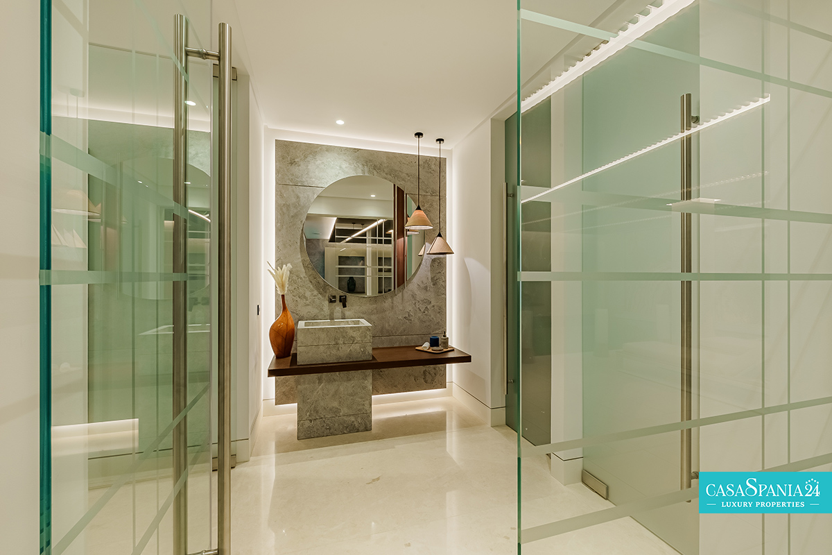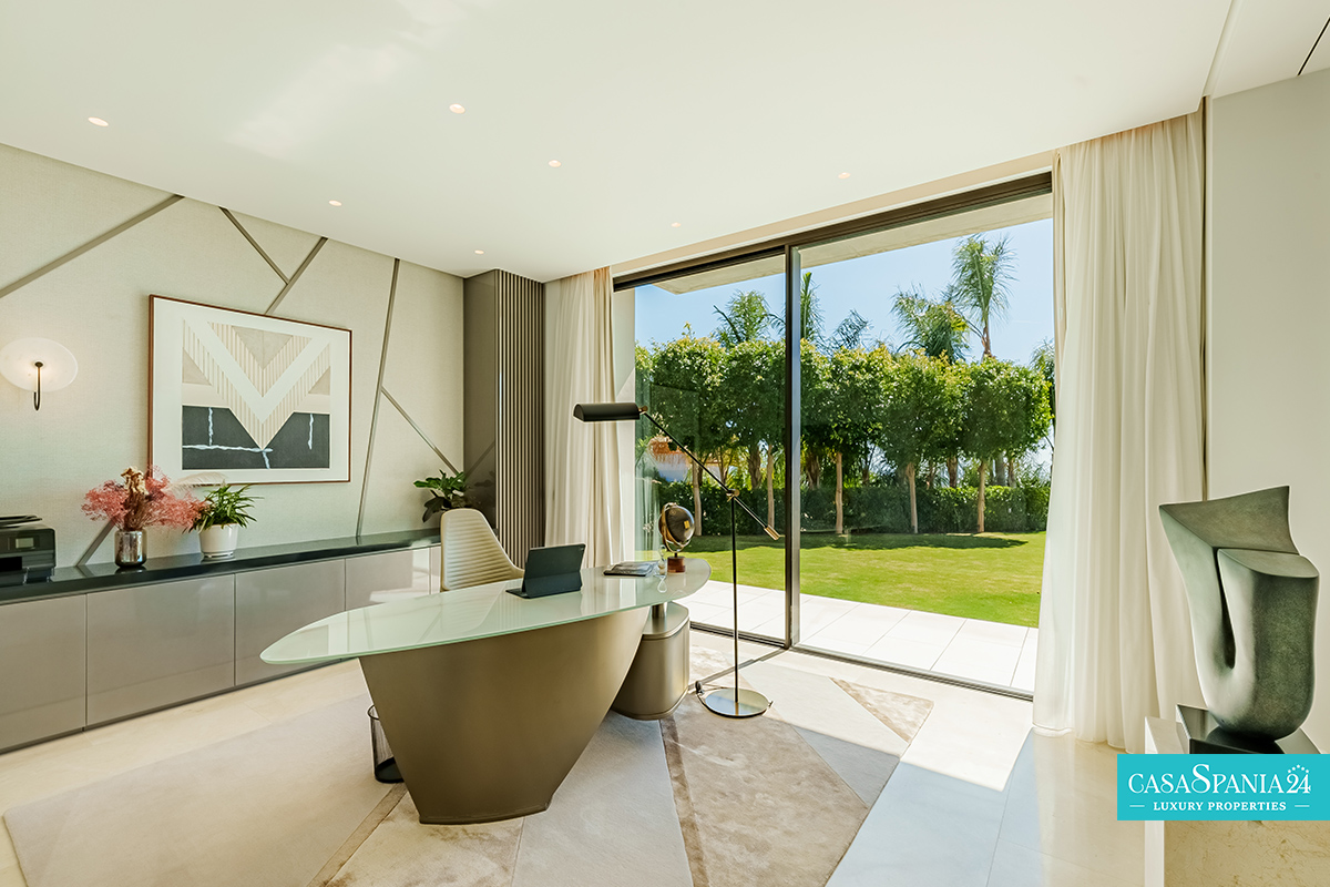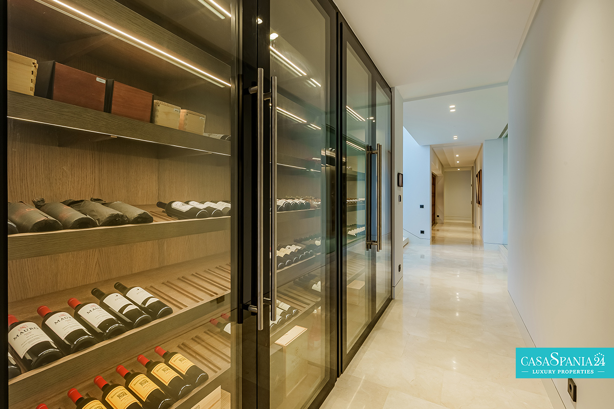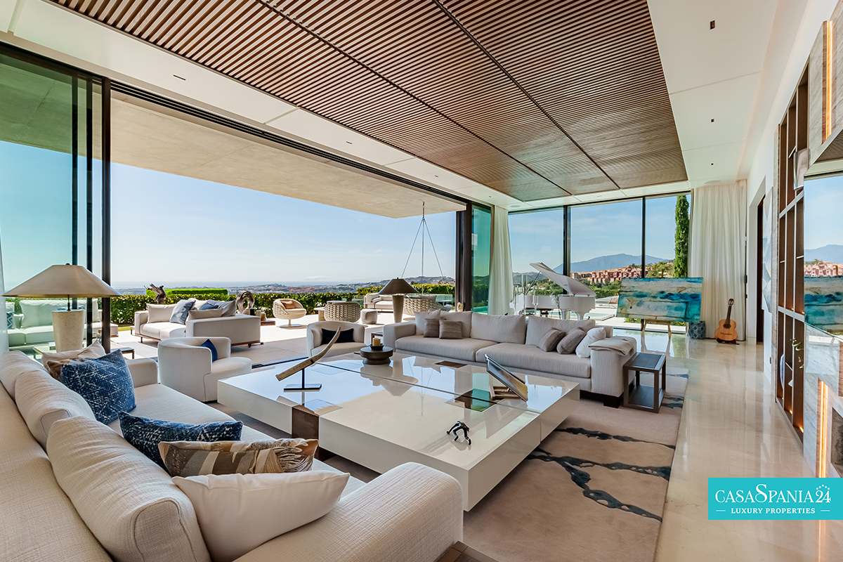 El salón es el punto focal de la casa, impresionando con sus altos techos y sus puertas correderas de cristal de altura completa, que se integran perfectamente en las paredes y crean una conexión natural entre el interior y el exterior. La luz natural inunda el espacio y realza los acabados de alta gama, dirigiendo la mirada hacia las amplias terrazas, el tranquilo jardín y la piscina infinita. El concepto abierto ofrece un ambiente acogedor, ideal tanto para momentos íntimos como para eventos elegantes.