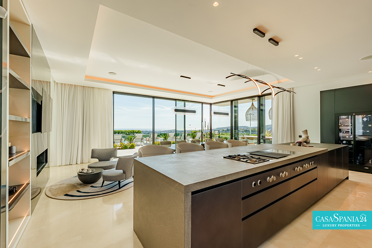 La moderna cocina, ubicada muy cerca del salón, combina un diseño contemporáneo con la máxima funcionalidad. Equipada con electrodomésticos de alto rendimiento, una isla central con placa de cocción integrada y muebles con acabados mate, ofrece el espacio perfecto para experiencias culinarias refinadas. La zona de desayuno, situada junto a los ventanales panorámicos, y el comedor contiguo permiten disfrutar de cada comida en un entorno espectacular, donde la elegancia y la comodidad se combinan en armonía.