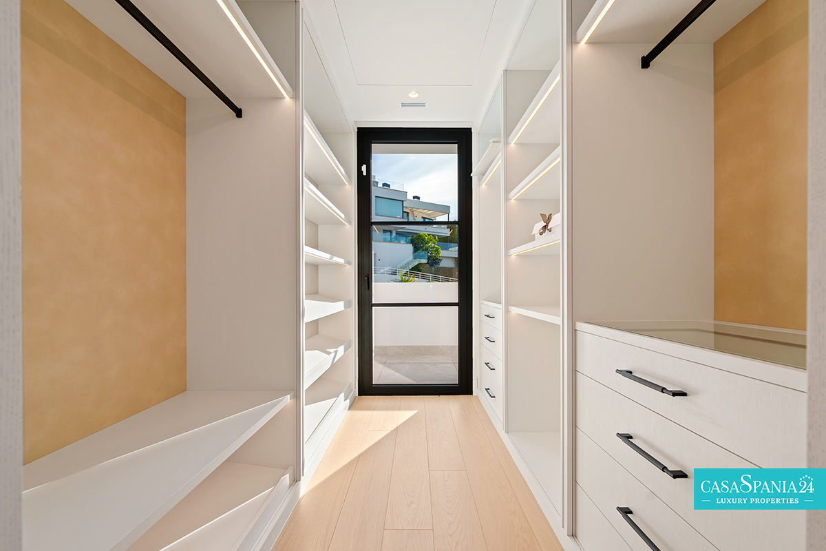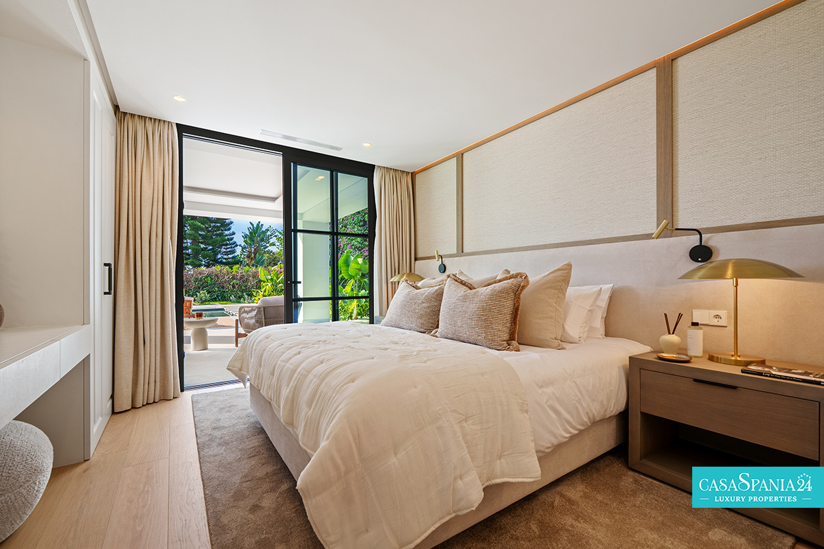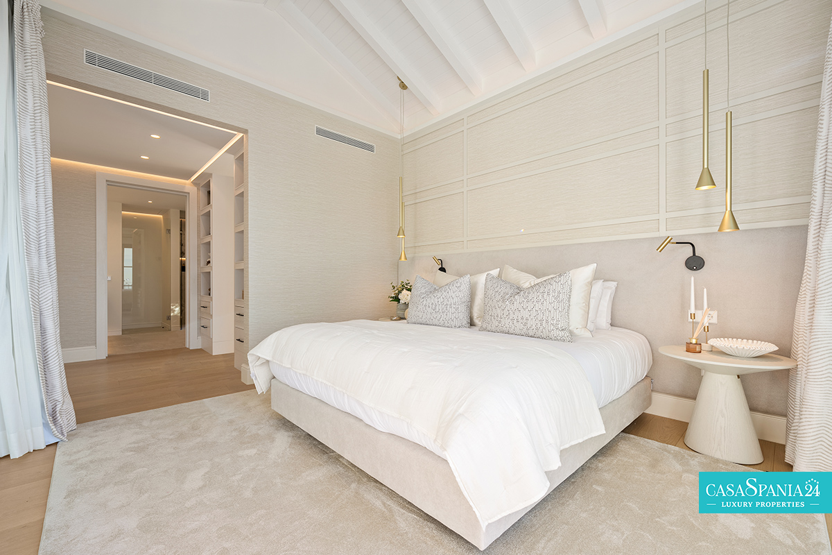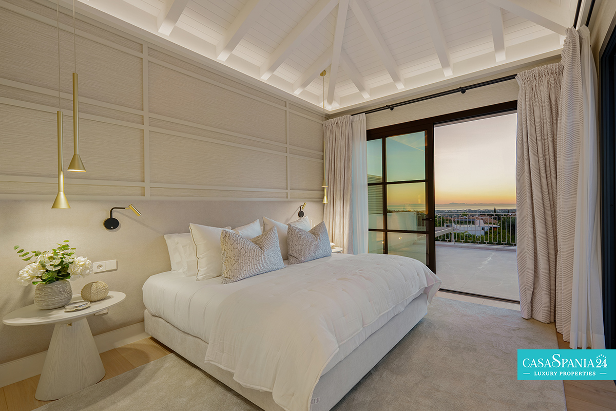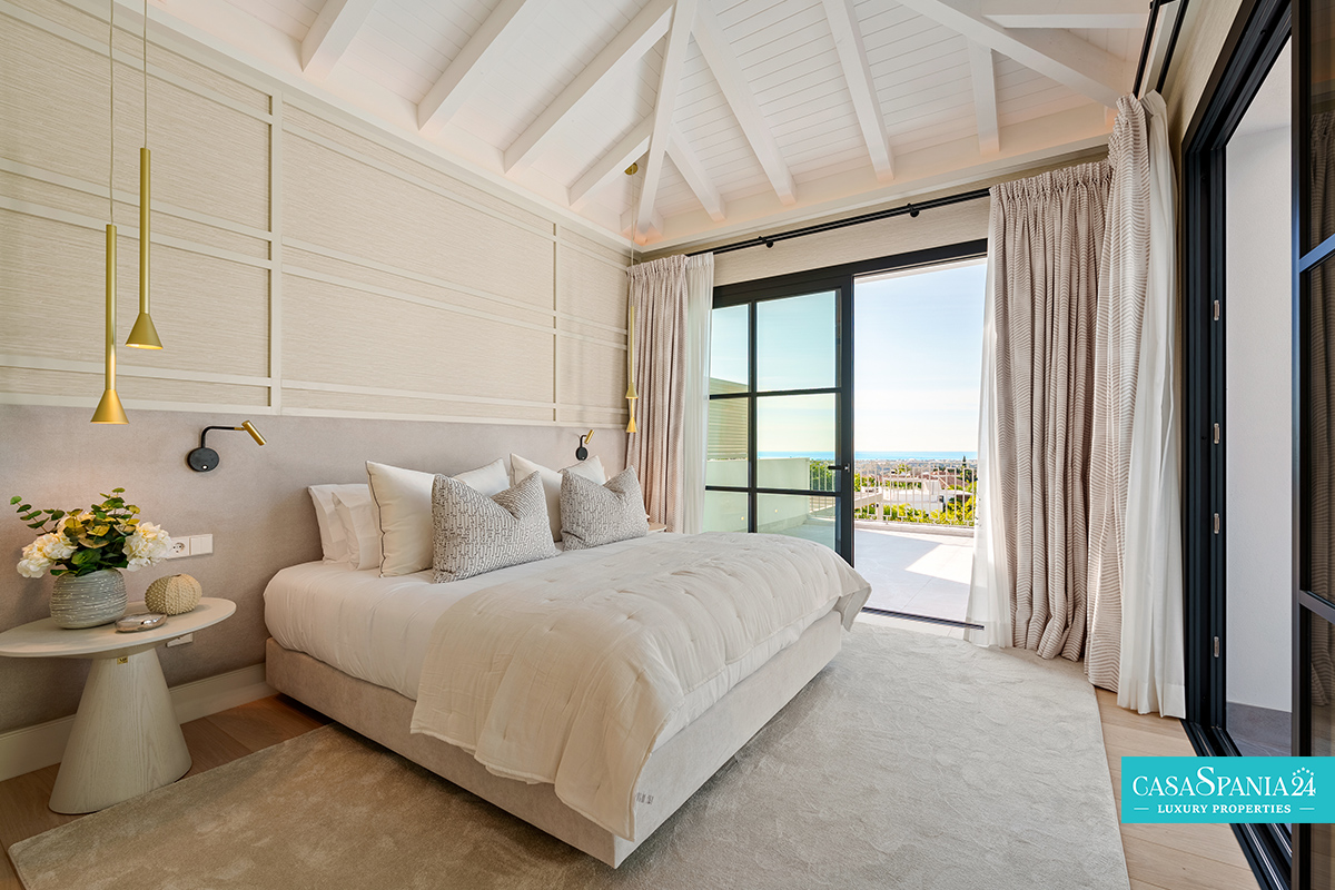 La villa cuenta con cinco dormitorios, cada uno con el dormitorio principal en la planta superior, que tiene acceso directo a la terraza. Cada habitación está decorada en tonos neutros, con elementos hechos a medida e iluminación cuidadosamente seleccionada, creando un ambiente elegante y relajante. La planta superior también ofrece acceso a amplias terrazas, desde donde se pueden admirar vistas panorámicas de la costa.