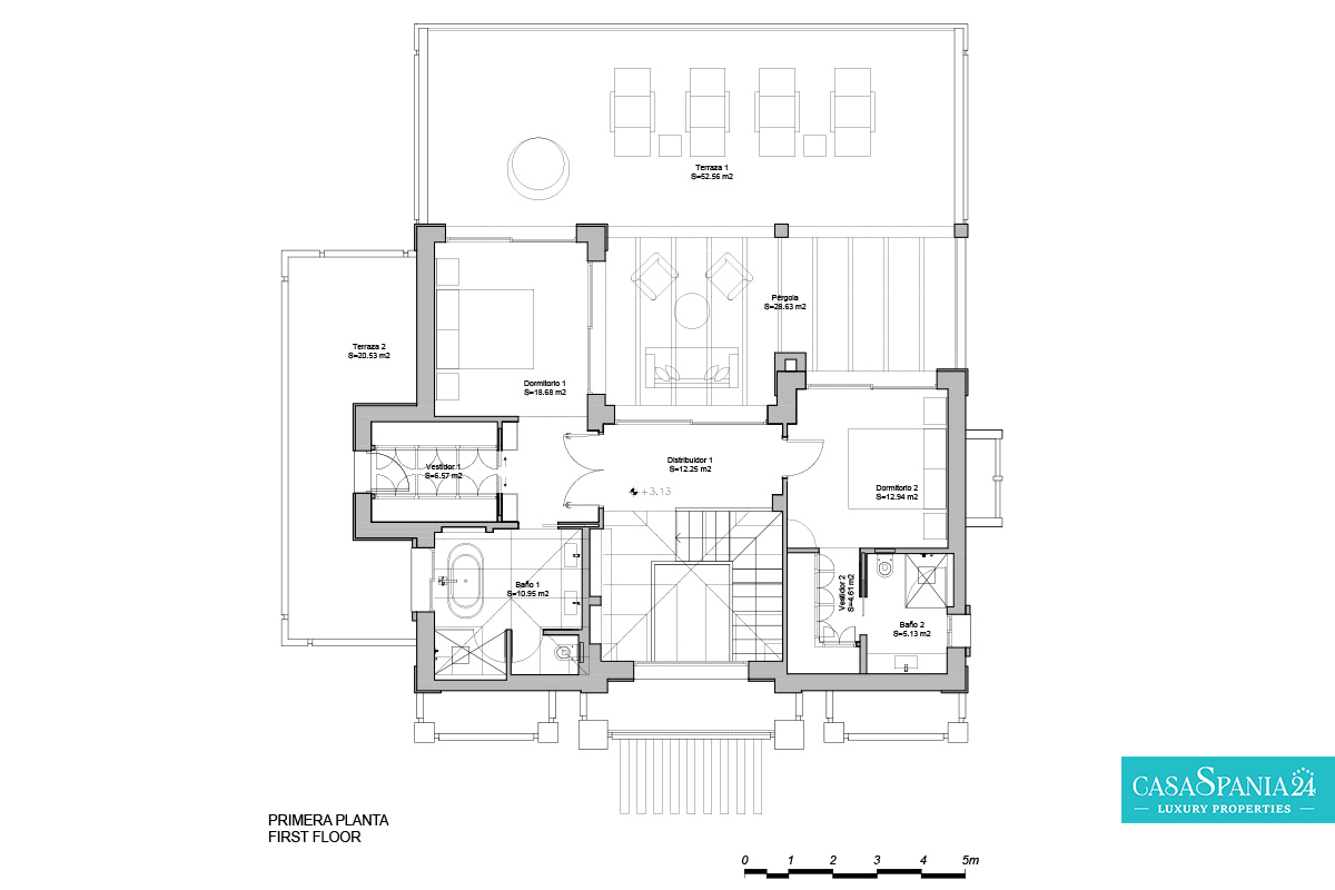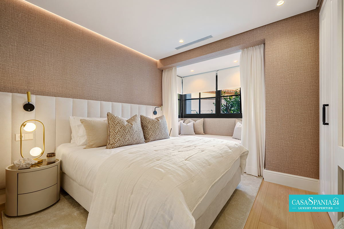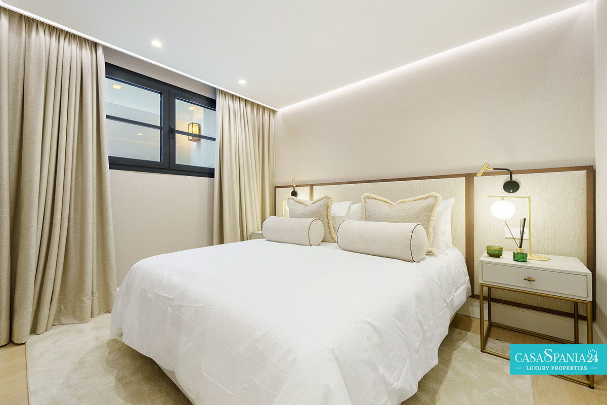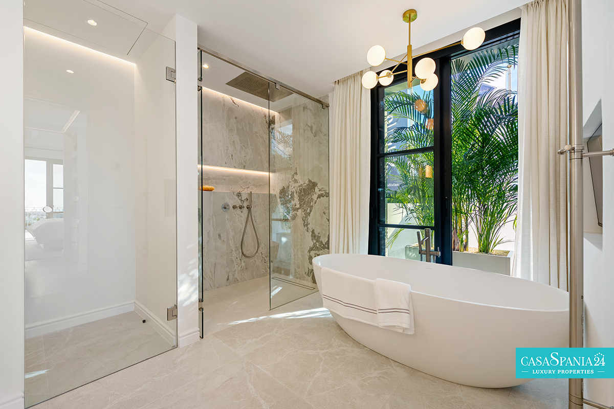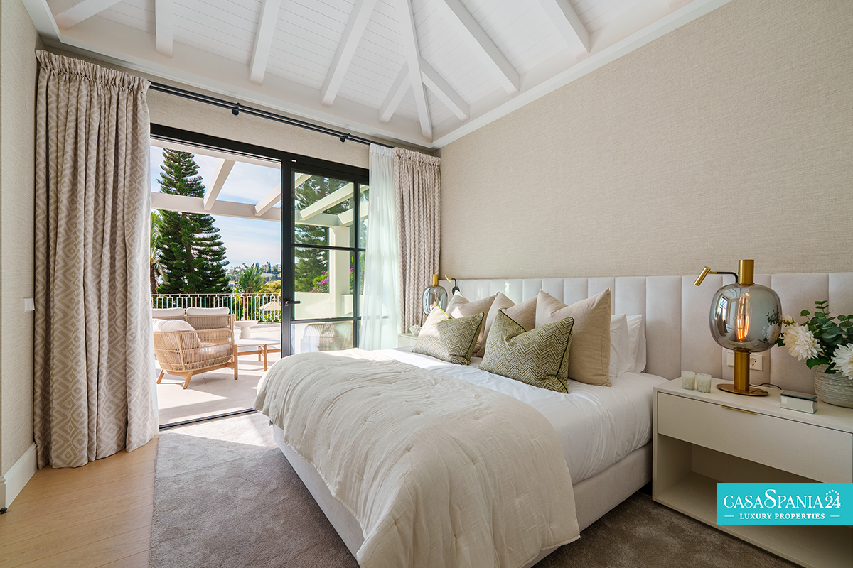 La villa cuenta con cinco dormitorios, cada uno con el dormitorio principal en la planta superior, que tiene acceso directo a la terraza. Cada habitación está decorada en tonos neutros, con elementos hechos a medida e iluminación cuidadosamente seleccionada, creando un ambiente elegante y relajante. La planta superior también ofrece acceso a amplias terrazas, desde donde se pueden admirar vistas panorámicas de la costa.