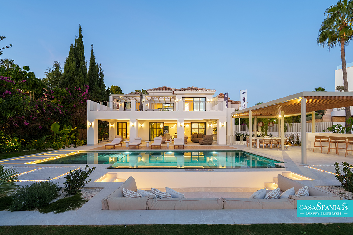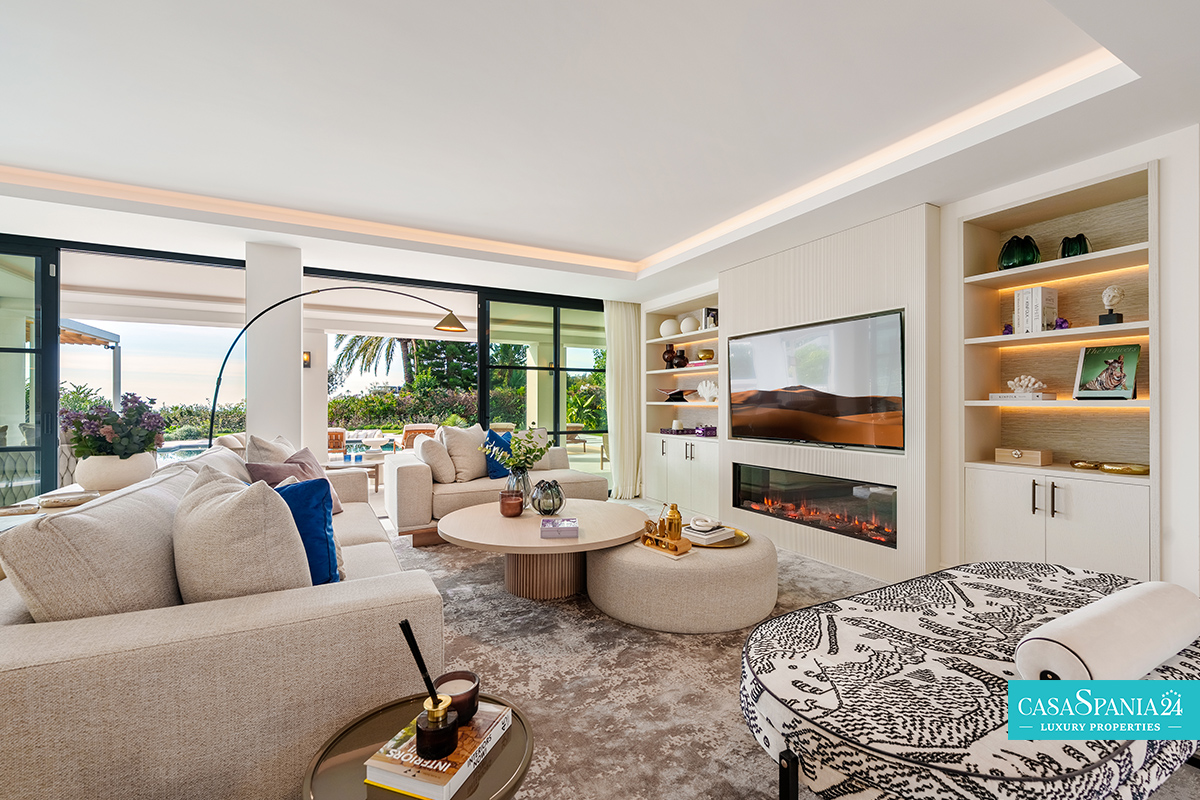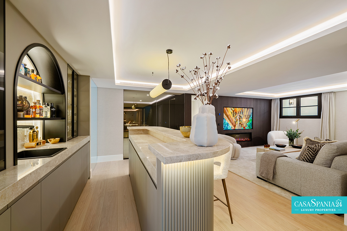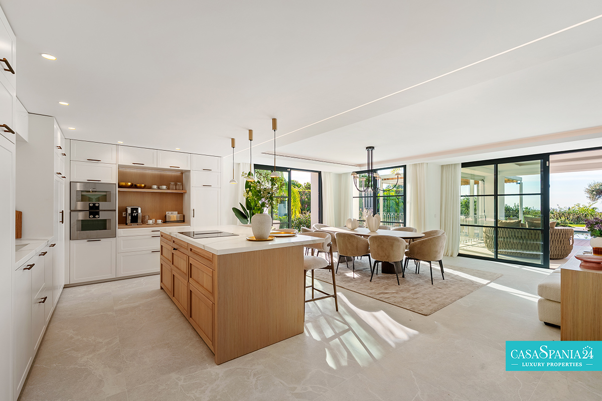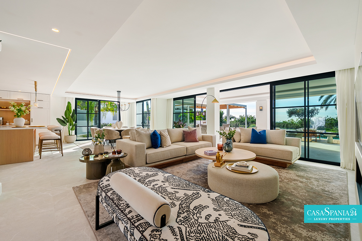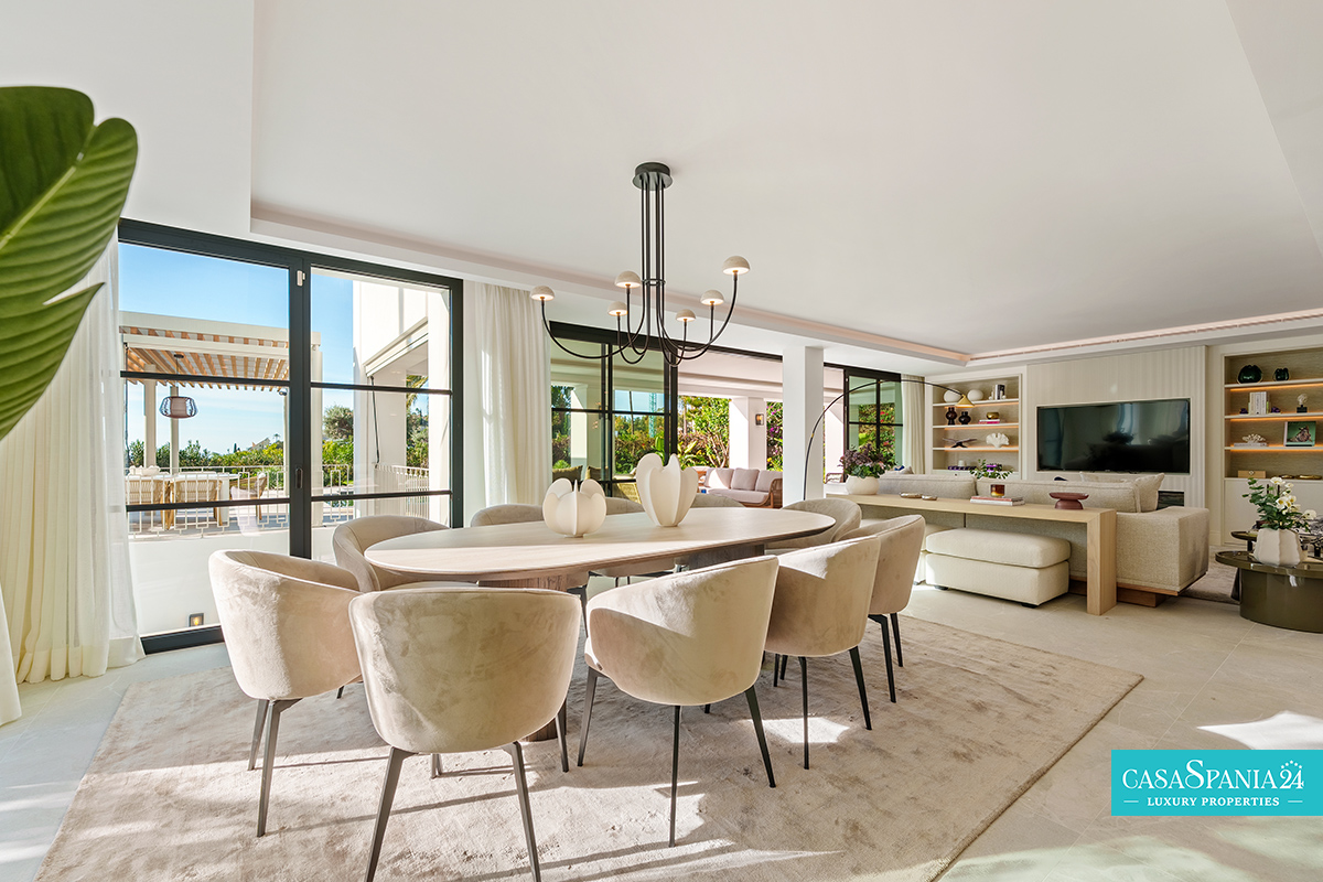 Villa mediterránea contemporánea ubicada en La Quinta, con espectaculares vistas al mar, en una parcela de 1.109 m² y recientemente renovada. La propiedad impresiona por su elegante arquitectura y sus sofisticados interiores de Soledad Merchant. El salón principal está diseñado como un espacio abierto y luminoso, con ventanales de suelo a techo, muebles a medida y una conexión natural con el exterior. El comedor y el salón completan armoniosamente el espacio, ofreciendo comodidad para el día a día y un entorno ideal para recibir invitados.