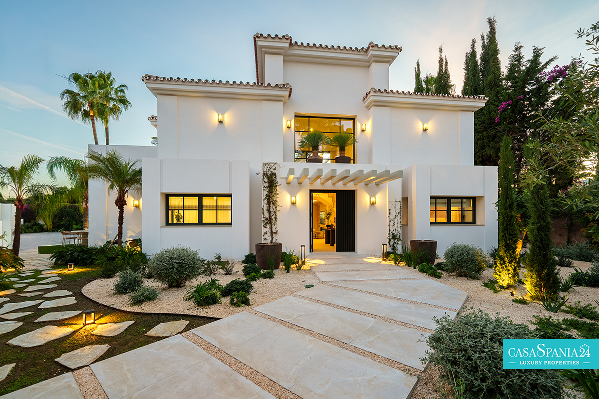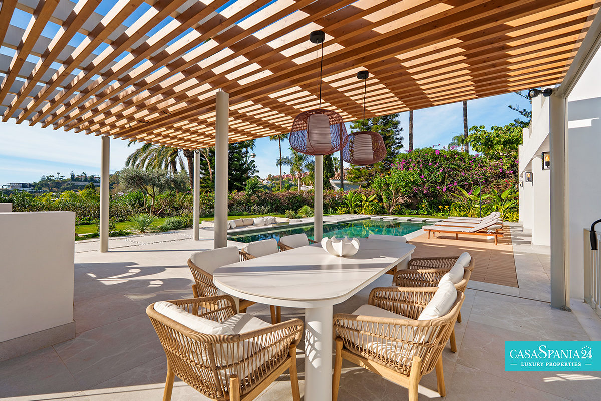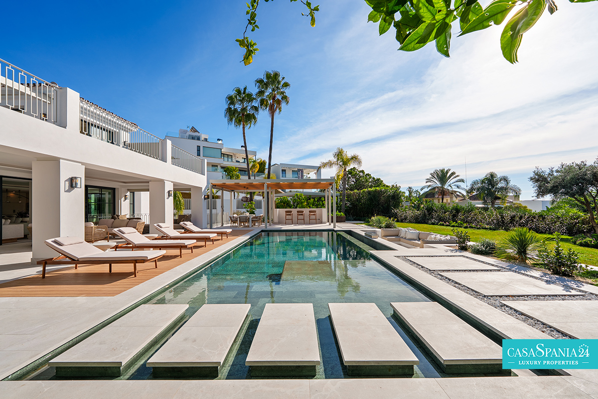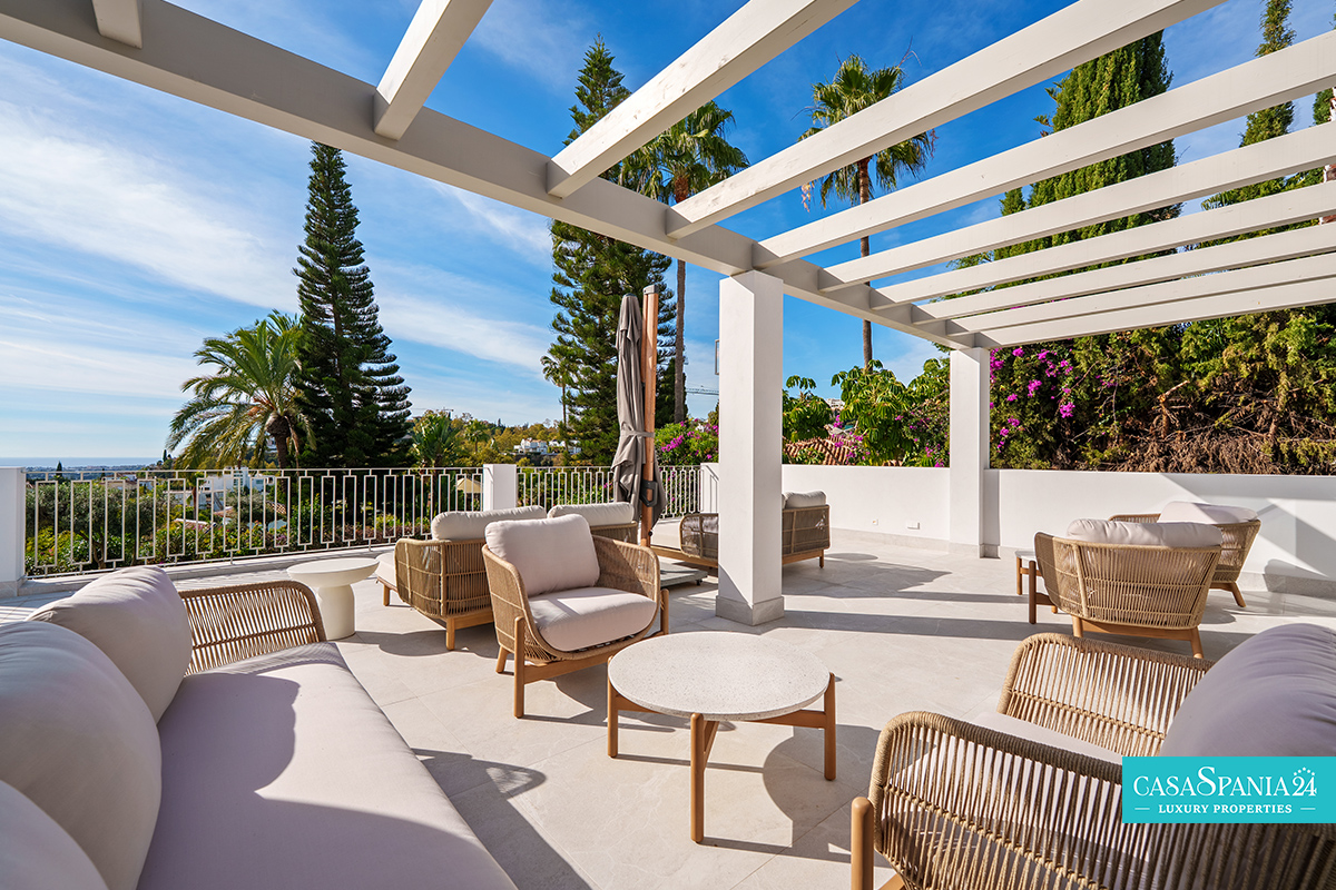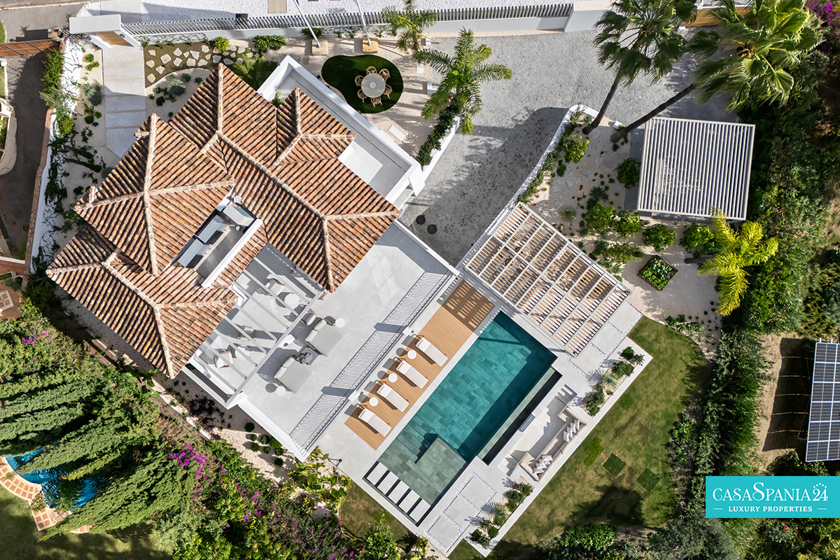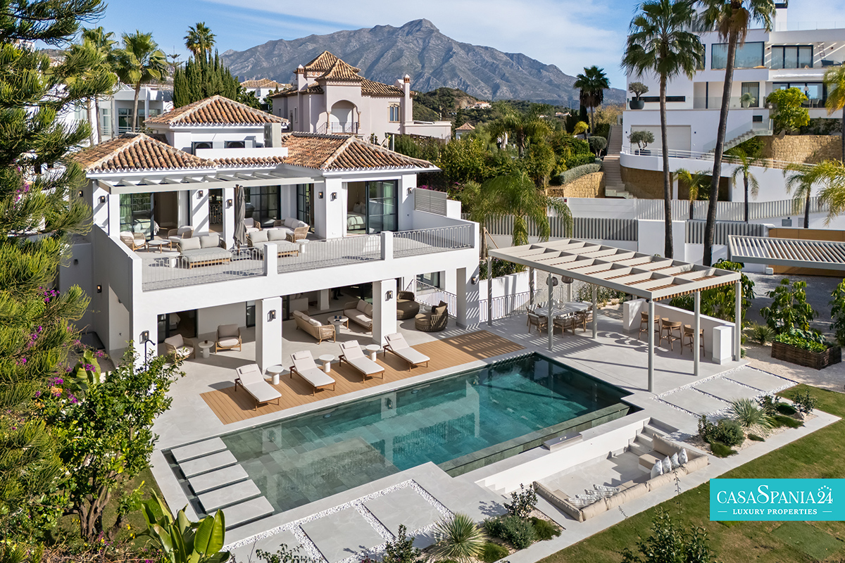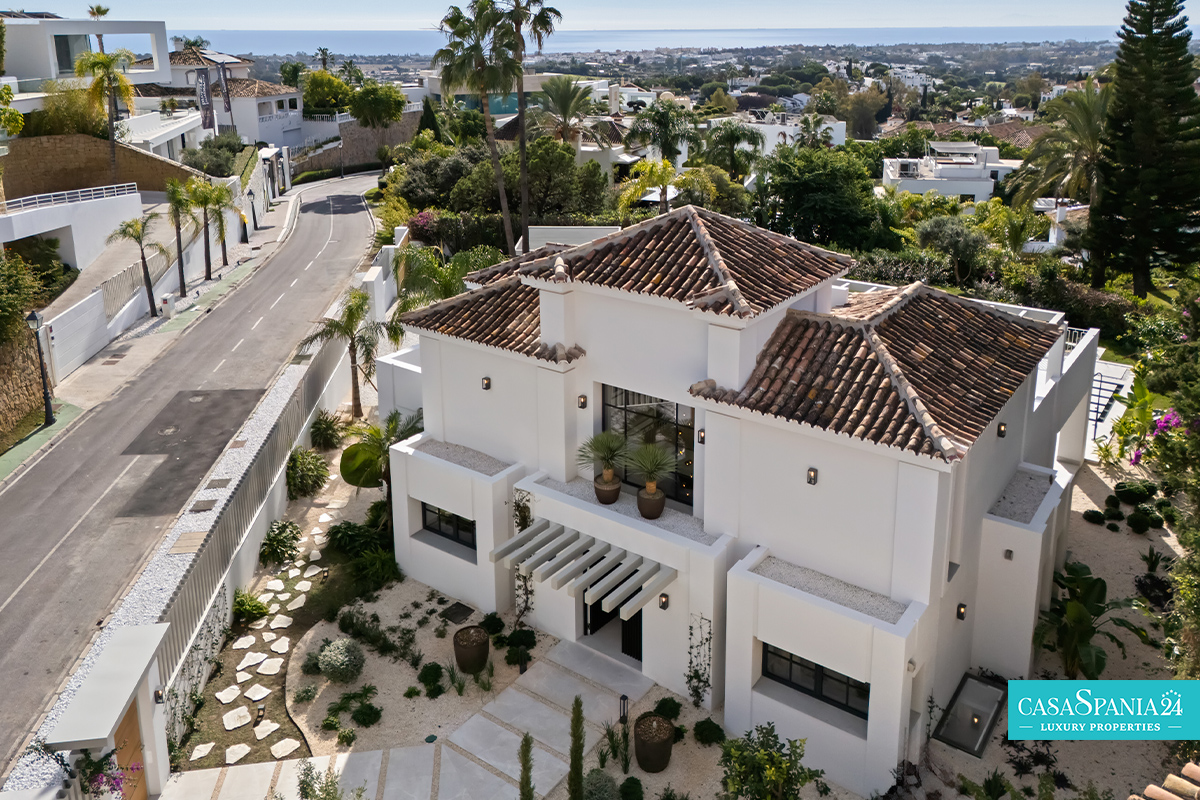 Villa mediterránea contemporánea ubicada en La Quinta, con espectaculares vistas al mar, en una parcela de 1.109 m² y recientemente renovada. La propiedad impresiona por su elegante arquitectura y sus sofisticados interiores de Soledad Merchant. El salón principal está diseñado como un espacio abierto y luminoso, con ventanales de suelo a techo, muebles a medida y una conexión natural con el exterior. El comedor y el salón completan armoniosamente el espacio, ofreciendo comodidad para el día a día y un entorno ideal para recibir invitados.