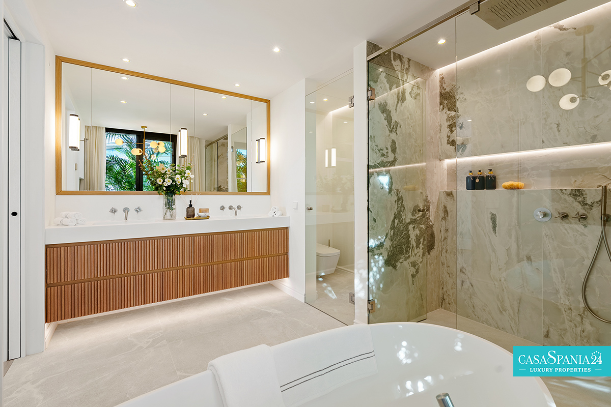 Una planta dedicada a la relajación y el entretenimiento completa la experiencia que ofrece la propiedad, incluyendo una sala de recreo, un gimnasio, una sauna y una bodega climatizada. En el exterior, el cuidado jardín rodea la piscina privada y múltiples zonas para relajarse y cenar al aire libre. Ubicada cerca de campos de golf, colegios internacionales y los servicios de Nueva Andalucía y Marbella, esta villa es una excelente opción para un estilo de vida moderno y exclusivo.