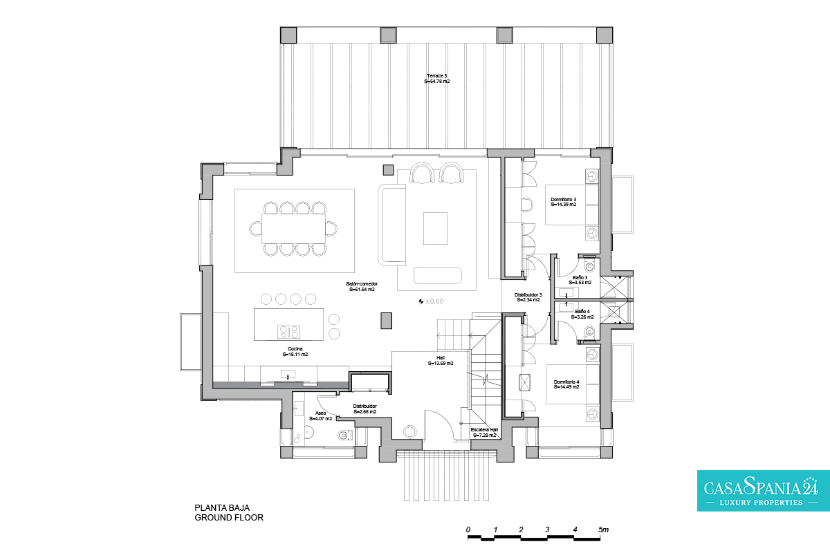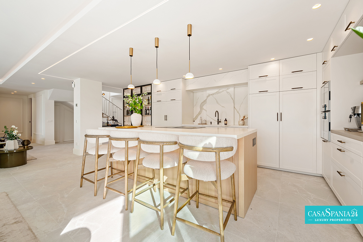 La cocina es uno de los elementos centrales de la casa, destacando por su diseño moderno, líneas limpias y materiales de alta calidad. Está equipada con una amplia isla, electrodomésticos integrados y amplios espacios de almacenamiento ocultos en muebles a medida. Su distribución abierta facilita la interacción, a la vez que proporciona acceso directo al salón, las terrazas y la zona de la piscina, transformando la planta baja en un espacio altamente funcional y atractivo.