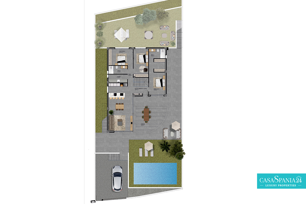 La villa cuenta con una piscina privada de 32 m² y amplias zonas ajardinadas, tanto delanteras como traseras, ideales para disfrutar del aire libre. Además, los residentes de estas villas tienen acceso a todas las instalaciones y zonas comunes del resort, lo que garantiza una experiencia completa de diversión, confort y lujo.