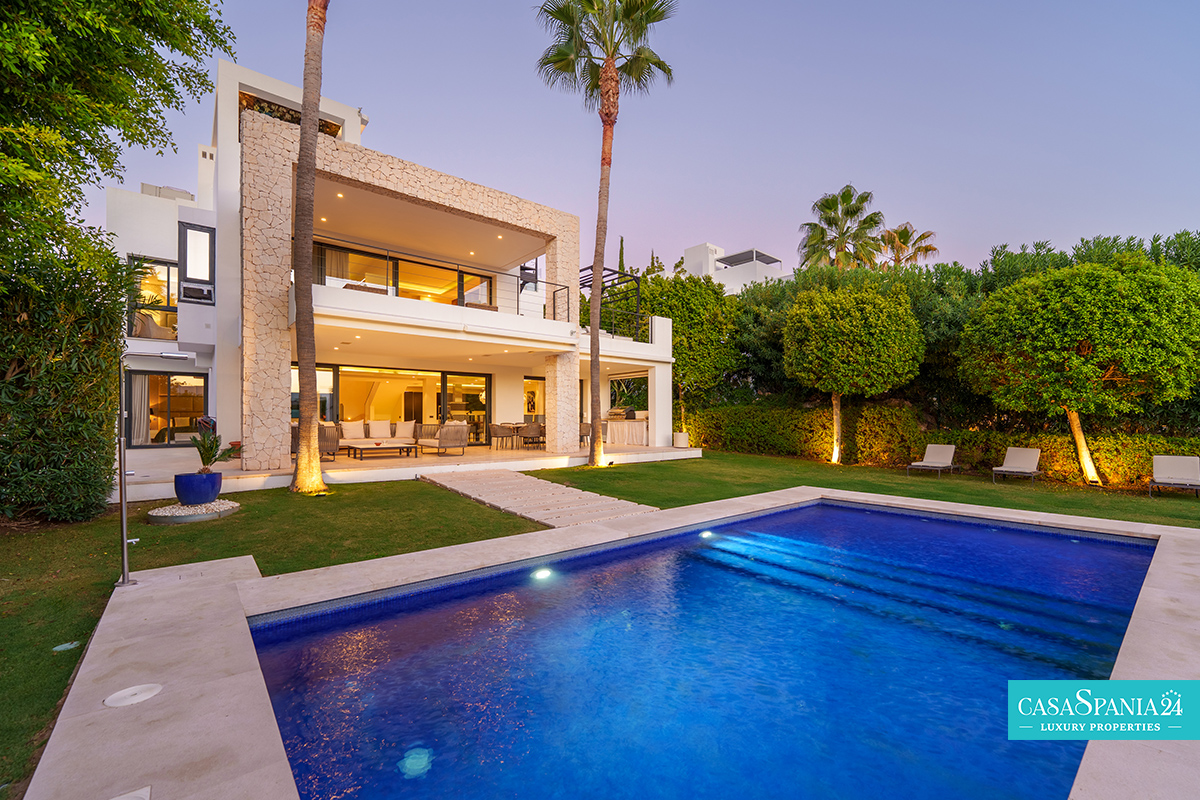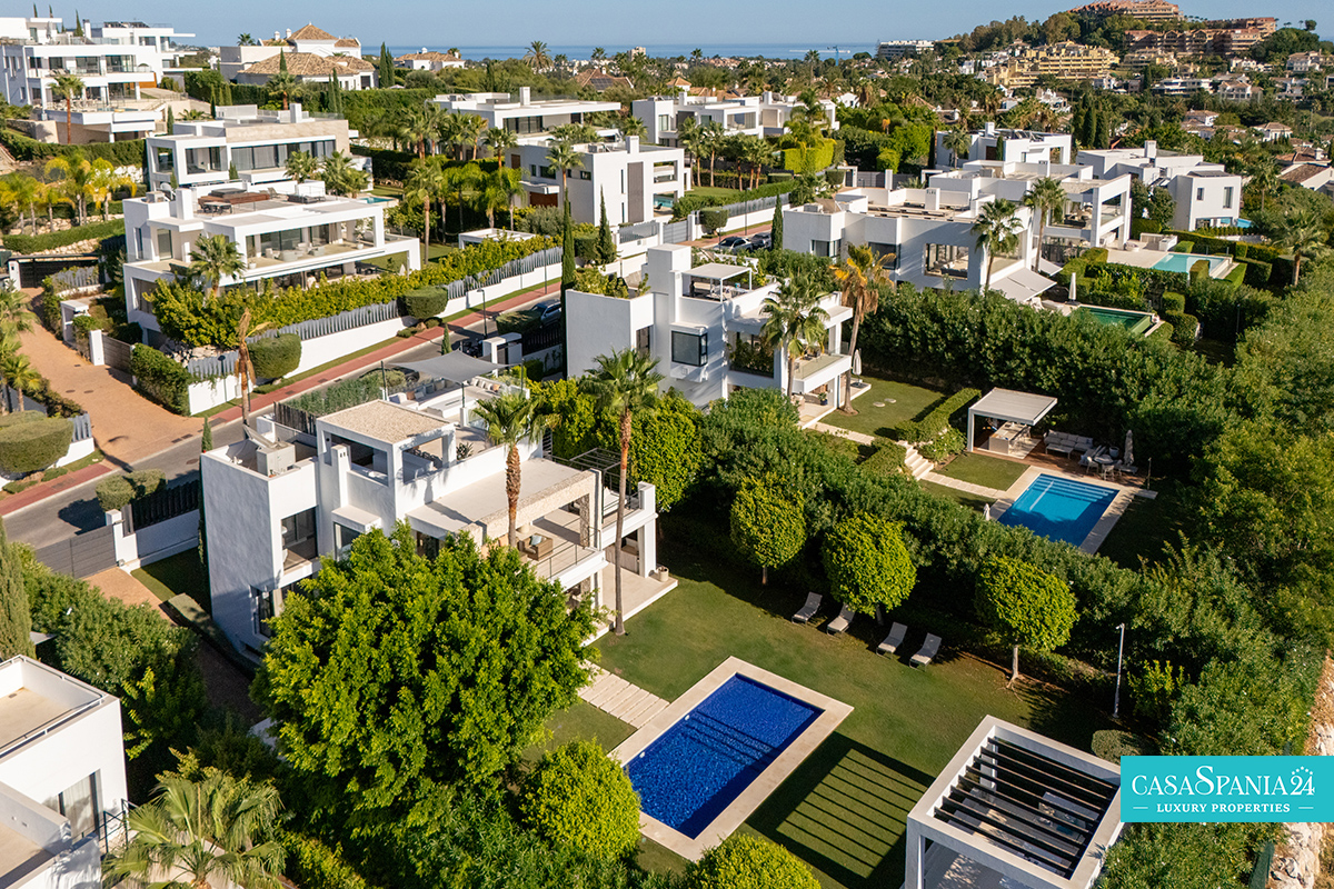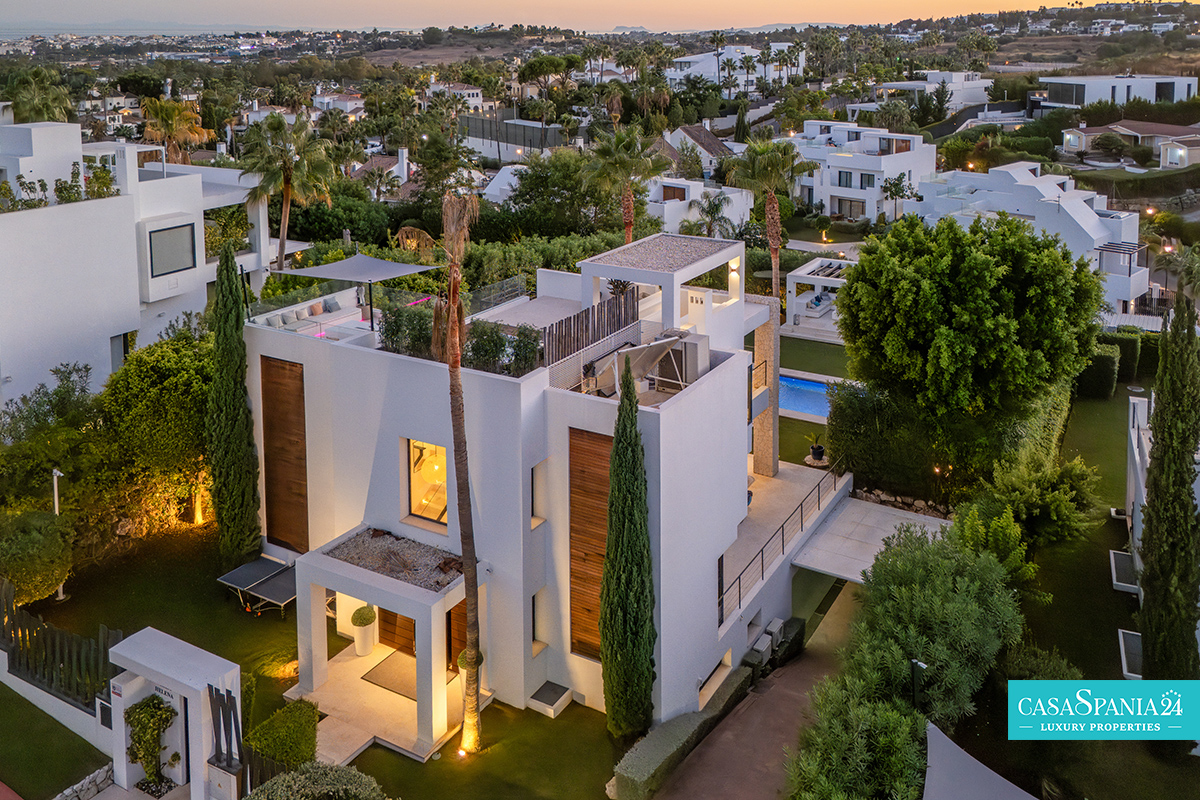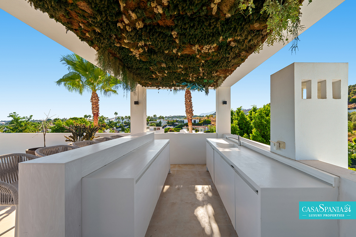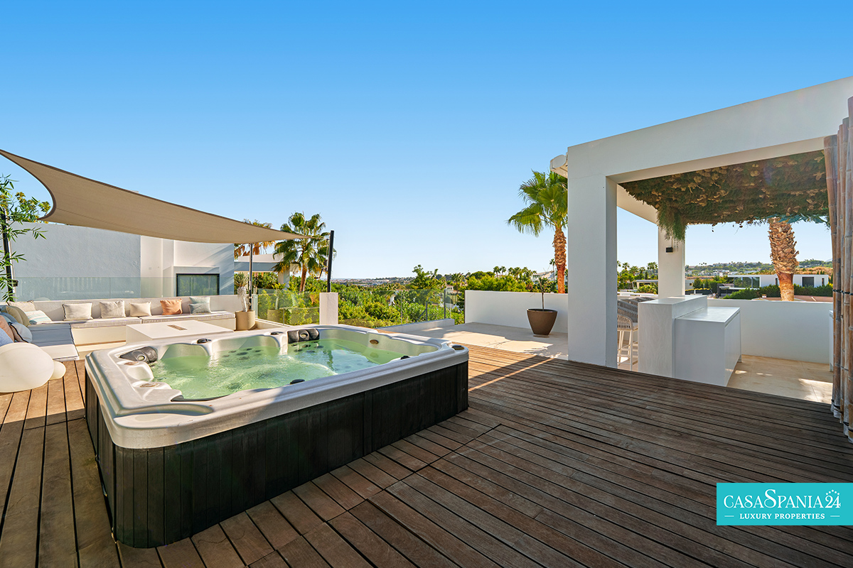 Una espectacular villa contemporánea, ubicada en una comunidad privada y segura en Nueva Andalucía, diseñada para ofrecer momentos de relajación y oportunidades para socializar con elegancia. La propiedad está rodeada de un jardín cuidadosamente diseñado, con exuberante vegetación, árboles ornamentales y una elegante pérgola que proporciona un espacio de sombra ideal para relajarse. La piscina privada, impecablemente mantenida y enmarcada por piedra natural, es el punto focal del exterior, mientras que la terraza superior, equipada con jacuzzi y solárium, invita a disfrutar de largos momentos de tranquilidad al aire libre.