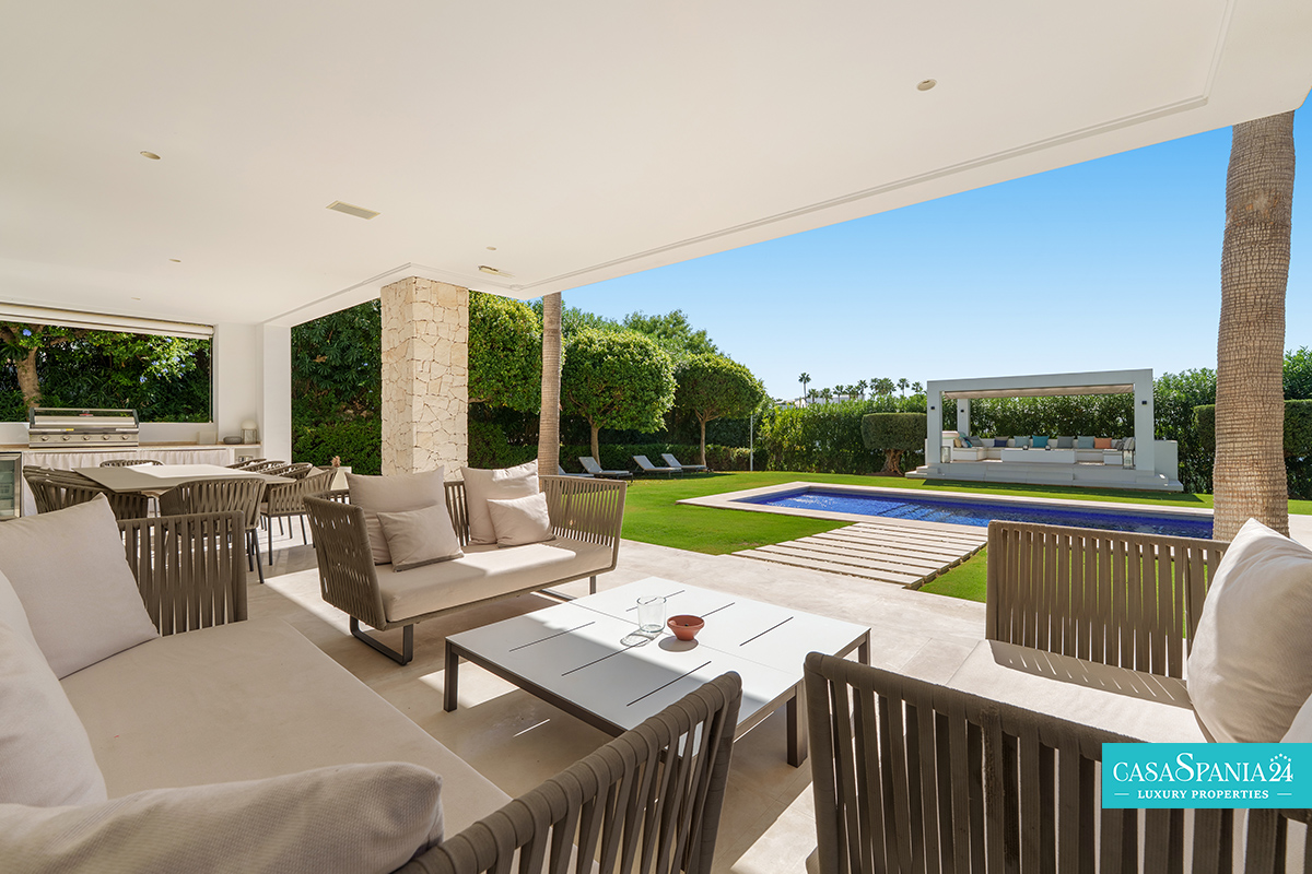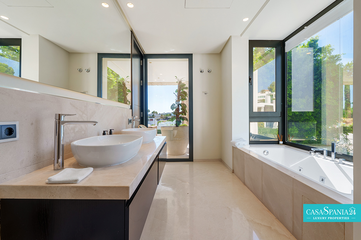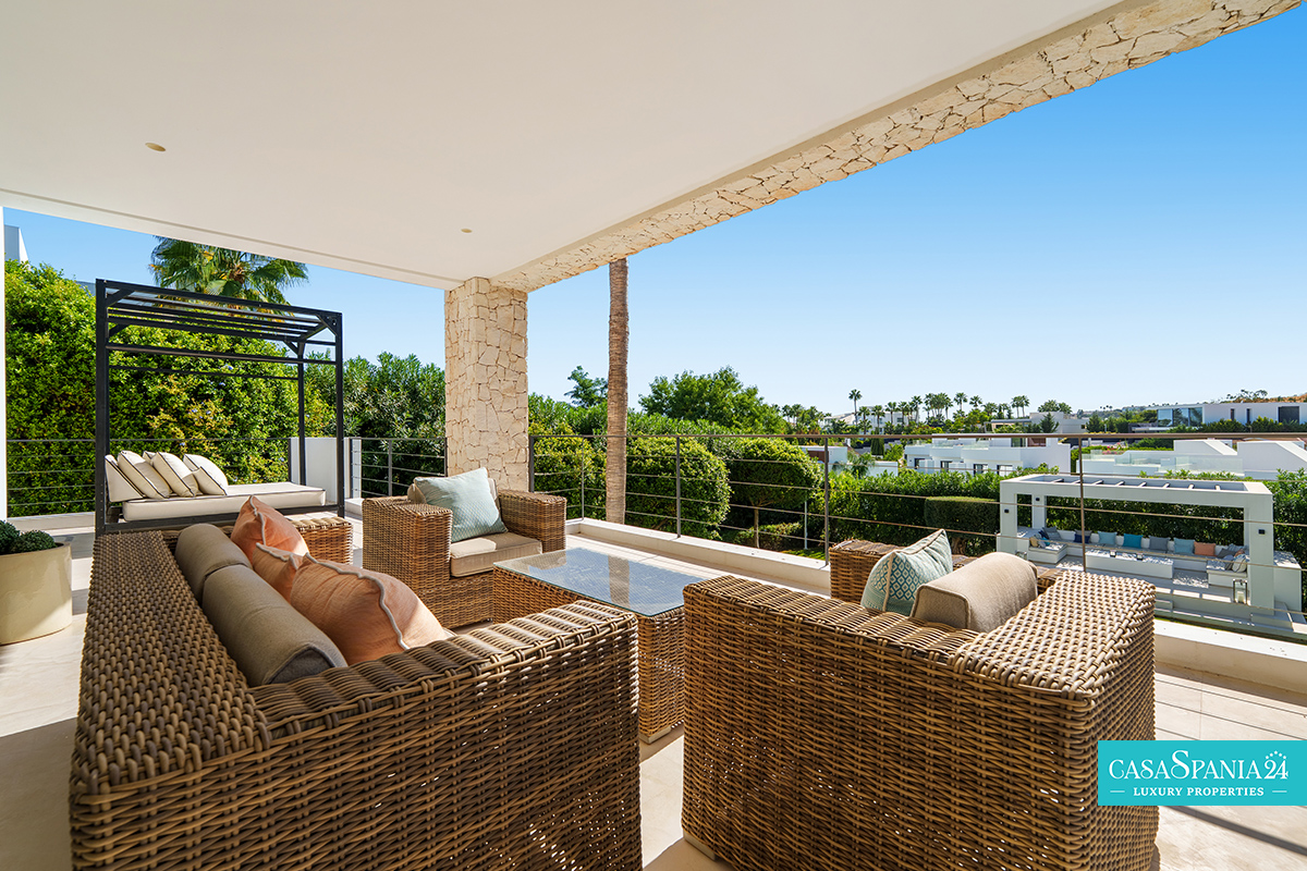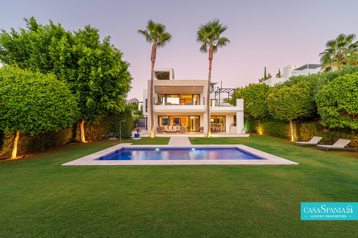 Una espectacular villa contemporánea, ubicada en una comunidad privada y segura en Nueva Andalucía, diseñada para ofrecer momentos de relajación y oportunidades para socializar con elegancia. La propiedad está rodeada de un jardín cuidadosamente diseñado, con exuberante vegetación, árboles ornamentales y una elegante pérgola que proporciona un espacio de sombra ideal para relajarse. La piscina privada, impecablemente mantenida y enmarcada por piedra natural, es el punto focal del exterior, mientras que la terraza superior, equipada con jacuzzi y solárium, invita a disfrutar de largos momentos de tranquilidad al aire libre.