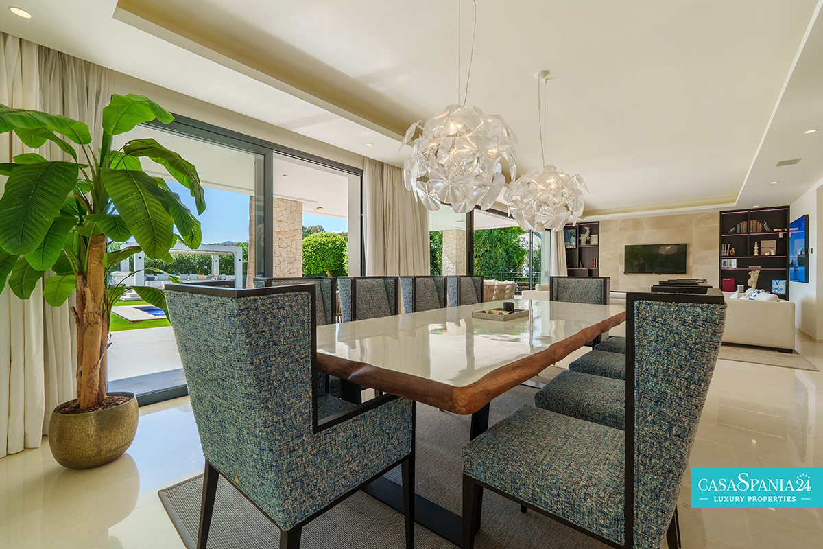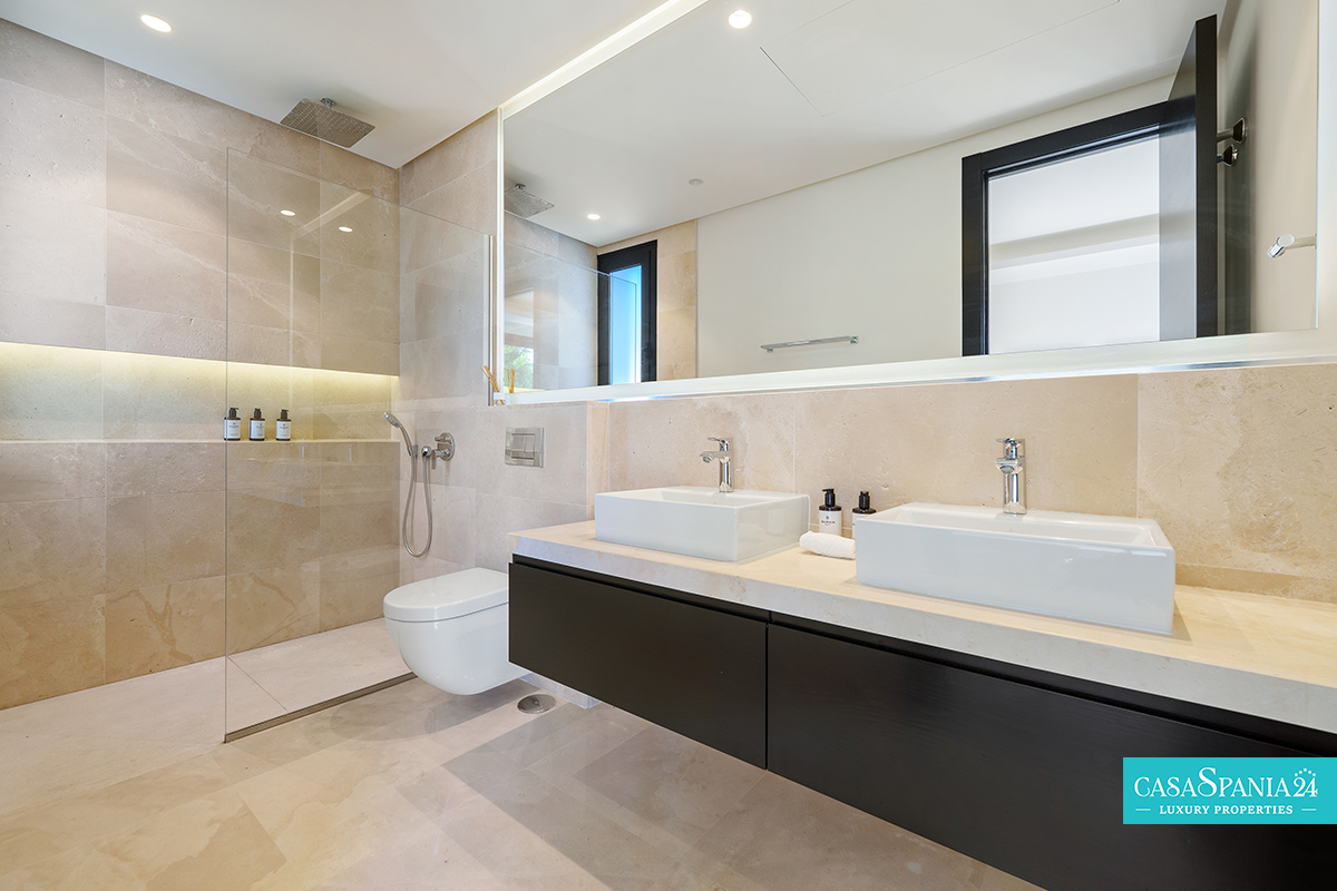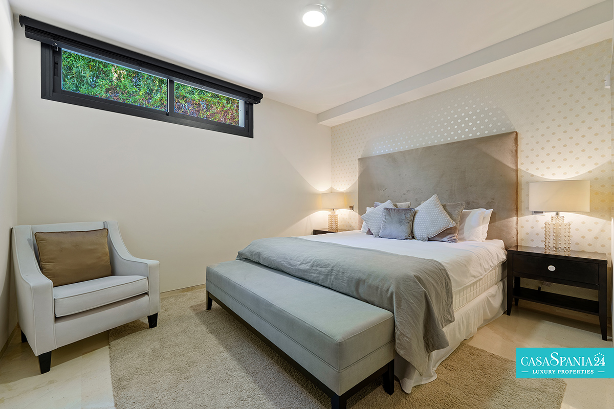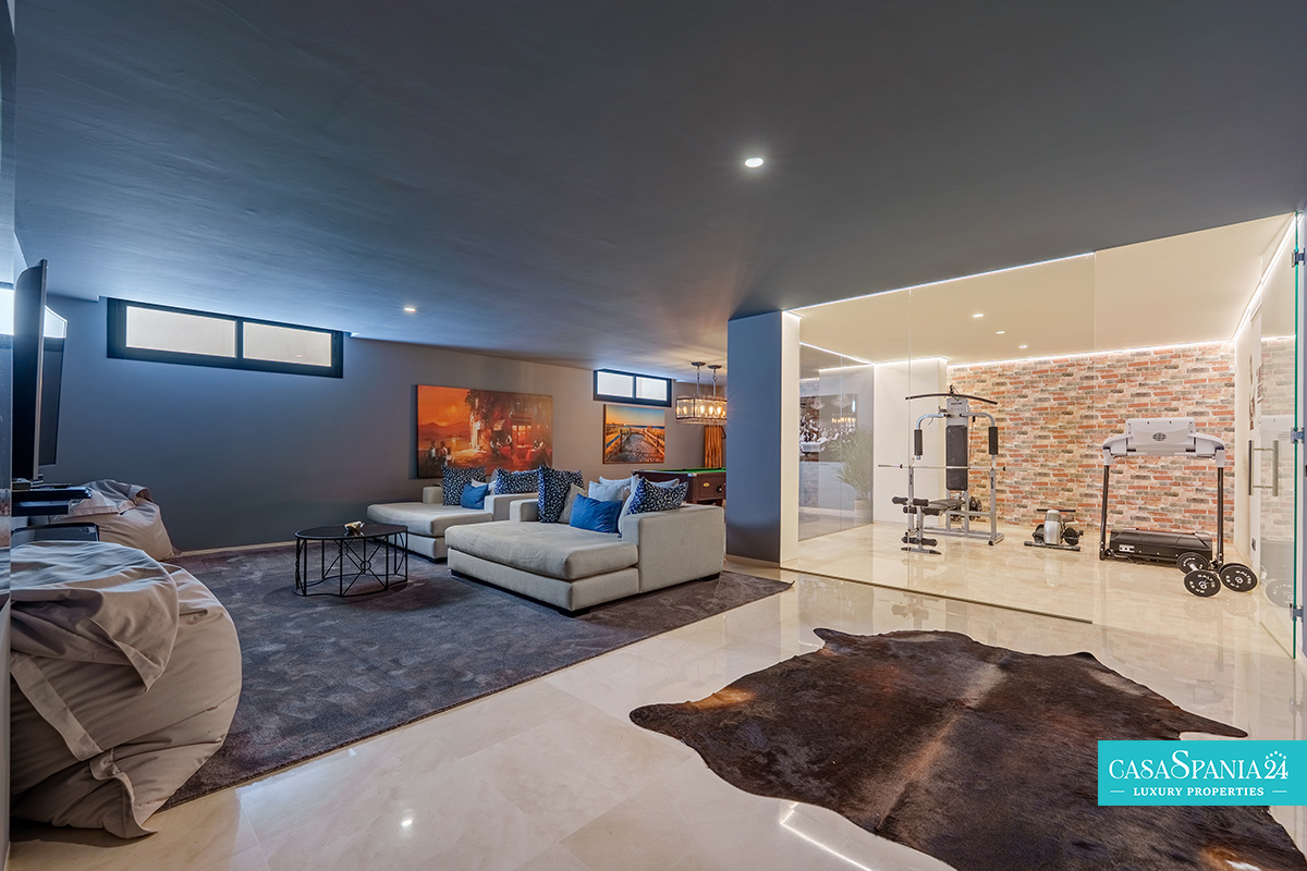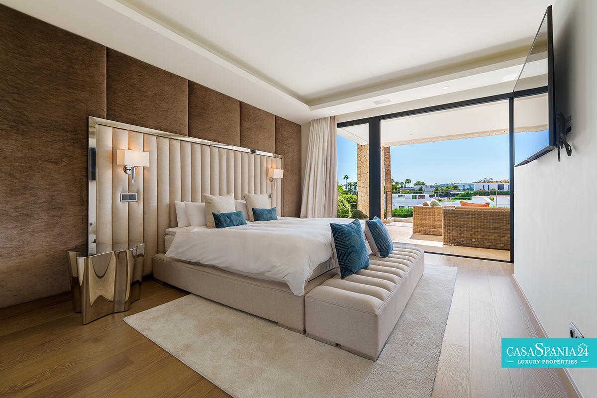 Una espectacular villa contemporánea, ubicada en una comunidad privada y segura en Nueva Andalucía, diseñada para ofrecer momentos de relajación y oportunidades para socializar con elegancia. La propiedad está rodeada de un jardín cuidadosamente diseñado, con exuberante vegetación, árboles ornamentales y una elegante pérgola que proporciona un espacio de sombra ideal para relajarse. La piscina privada, impecablemente mantenida y enmarcada por piedra natural, es el punto focal del exterior, mientras que la terraza superior, equipada con jacuzzi y solárium, invita a disfrutar de largos momentos de tranquilidad al aire libre.