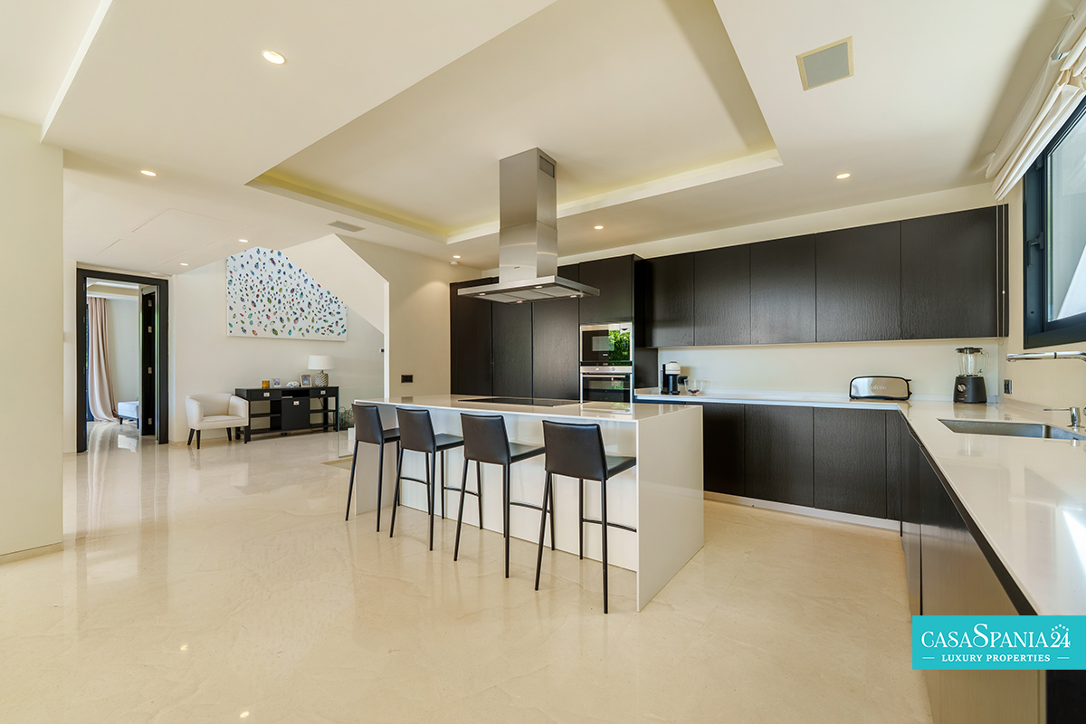 El interior impresiona por su elegancia moderna y acabados de primera calidad, como suelos de mármol, una discreta iluminación ambiental y amplios espacios abiertos. El salón-comedor se integra armoniosamente con la cocina ultramoderna, equipada con muebles minimalistas en tonos oscuros, una amplia isla central y electrodomésticos de alta calidad perfectamente integrados en el diseño.