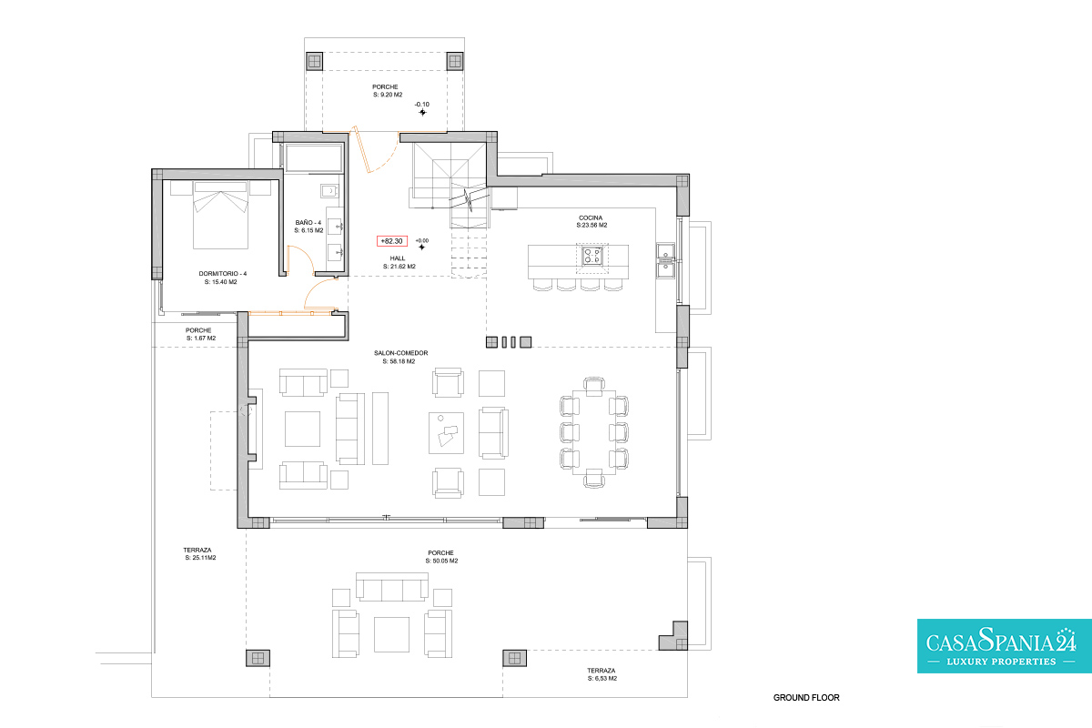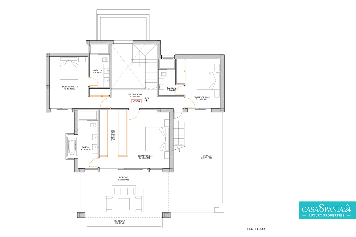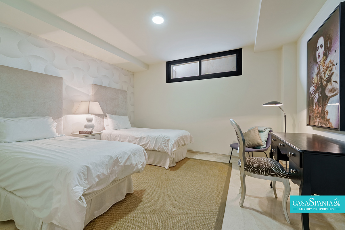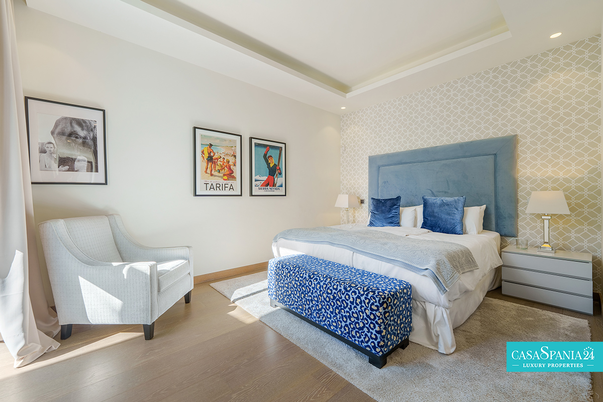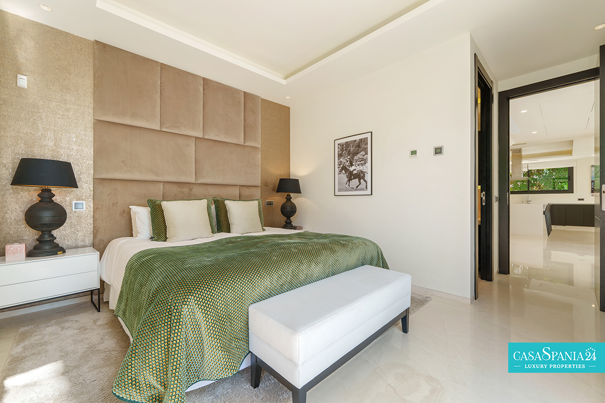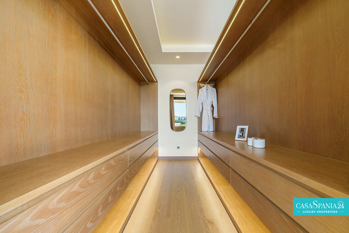 El dormitorio principal ofrece un espacio íntimo y confortable, con una cama king-size, un amplio vestidor y acceso directo a una terraza privada, ideal para relajarse. La propiedad también cuenta con un garaje privado y una amplia entrada, lo que aumenta el nivel de comodidad y seguridad. Combinando un sofisticado diseño interior con acogedores espacios exteriores, esta villa refleja fielmente el estilo de vida mediterráneo moderno.