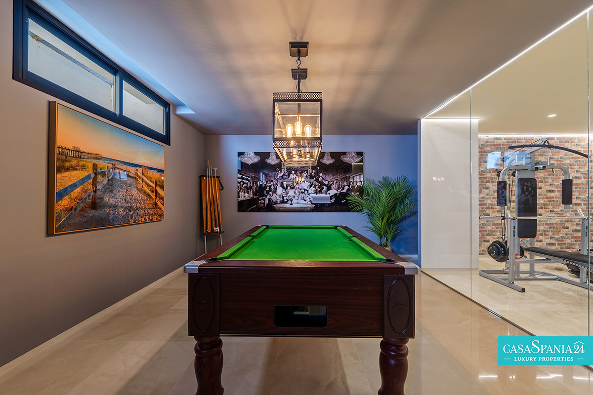 Las ventanas corredizas de suelo a techo conectan a la perfección el interior con la terraza cubierta para disfrutar de comidas al aire libre. Con una barbacoa de obra y cómodas zonas de estar, este es el lugar perfecto para cenar al aire libre o disfrutar de una velada. En la planta baja, la zona de ocio incluye un elegante bar, una mesa de billar y un sofisticado salón decorado con arte contemporáneo, complementado por un gimnasio privado con paredes de cristal y detalles de ladrillo visto.