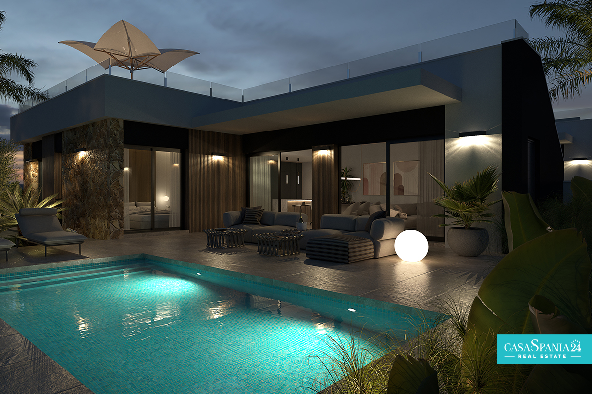 El modelo Julieta es una villa moderna, diseñada en forma de L, que ofrece privacidad y comodidad, con vistas directas a la piscina privada tanto desde el salón como desde el dormitorio principal. La vivienda se distribuye en una sola planta e incluye un amplio salón, una cocina abierta totalmente equipada con electrodomésticos empotrados, 3 luminosos dormitorios y 2 elegantes baños.